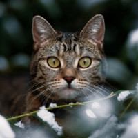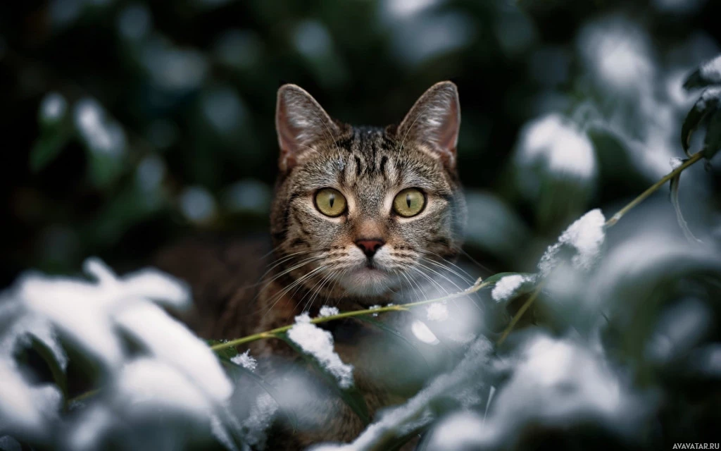 The image shows a cat peering out from among what appears to be snow-covered plants or shrubs. The cat's eyes are wide open, and its ears are perked up in an alert position. The setting looks like it could be during