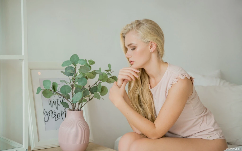 На картинке изображена женщина с закрытыми глазами, сидящая в спальне. Она кажется расслабленной или глубокомысленной. Комната имеет розоватый оттенок и включает в себя такие предметы, как обрамленная картина на стене и растение в горшке рядом с ней. На переднем плане также видно горшечное растение. Ее волосы светловолосые, и у нее, кажется, нежное выражение лица.