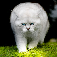 The image shows a cat walking on grass. It appears to be a large, fluffy cat with