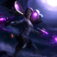 the magical aura surrounding them. They are holding a staff with a glowing purple orb at the top, suggesting they have