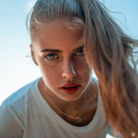 artistic look. The background is slightly blurred, drawing focus to her face.