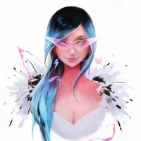 the artistic flair of the image. Her expression is calm and she appears to be looking directly at the viewer. The background is plain white, putting the focus entirely on the character.