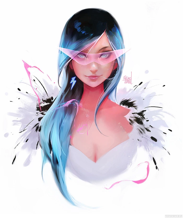 a female character with blue hair and sunglasses. She has a modern, possibly cyberpunk or futuristic appearance, and there's a splash of pink liquid around her neck area, which adds to