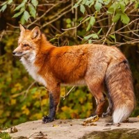 a natural setting with trees and shrubbery that are colored with autumnal hues, suggesting it might be fall season. The fox is looking towards something off-camera, possibly an object or another animal.