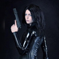leather bodysuit and is holding a pistol with one hand while the other hand is also holding what appears to be another item, possibly a weapon or an accessory related to her cosplay. The woman has