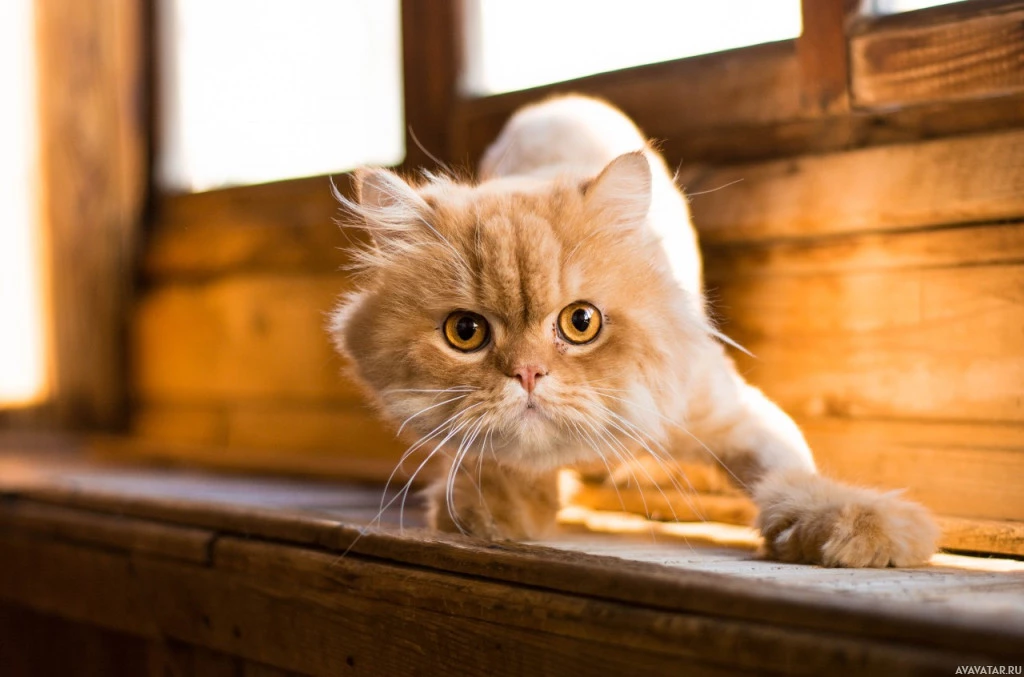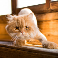 a wooden structure or box with openings for windows. The cat has its paws out and seems to be looking curiously at something, possibly the camera, as it's focused on an object outside of the frame.