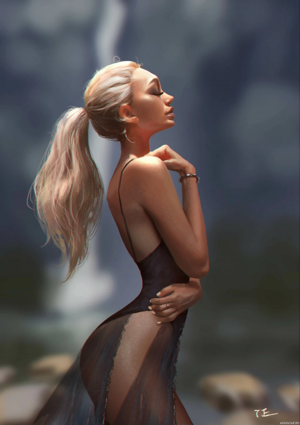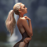 a female character with blonde hair styled in loose waves. She appears to be standing near a body of water, possibly a river or lake, based on the mist and the backdrop that seems to depict a serene
