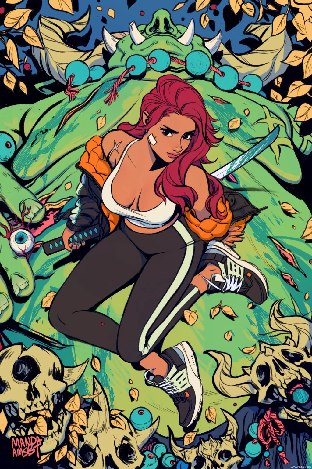 red hair, holding a sword. She is lying down on her stomach among what looks like bones and skulls, suggesting a grim or macabre setting. Her outfit includes a jacket with what seems to be