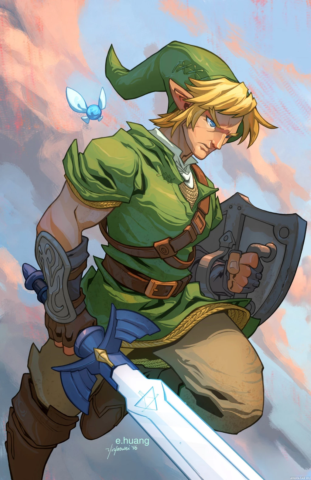 This is an illustration of a character from the "The Legend of Zelda" series, which is a popular action-adventure game. The character depicted is Link, who is known as an elf in this particular artwork. He is holding a sword in his right hand and wearing armor, indicating that he is prepared for battle or adventure. The background features
