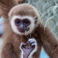 На картине изображена молодая обезьяна с коричневым мехом. Похоже, что он участвует в игривом поведении, возможно, взаимодействуя с какой-то травой или листвой. Окружающая среда предполагает, что это может быть естественная среда обитания или ограждение зоопарка, которое напоминает его естественное окружение.