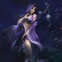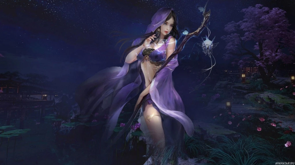 a nighttime scene due to the dark colors and starry sky background. The character is holding a staff or wand, which could suggest she has some sort of magical abilities or is part of