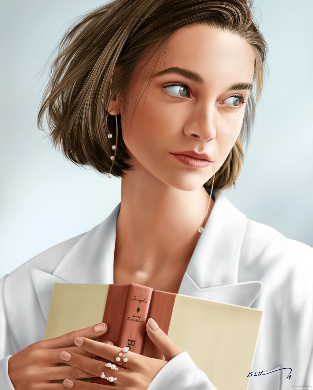 short hair and is wearing what seems to be a white lab coat, suggesting she may be a scientist or a professional in a field that requires such attire. In her hands, she holds what looks like