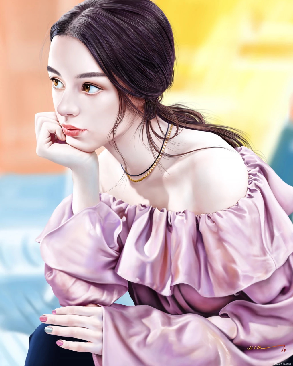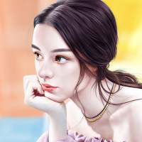 a young woman who appears to be in thoughtful or contemplative pose. She is depicted with long,