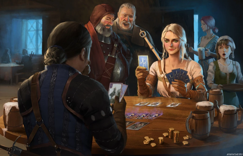a card game or some form of social interaction around playing cards. The setting looks like it could be a tavern or a similar establishment within