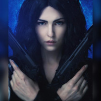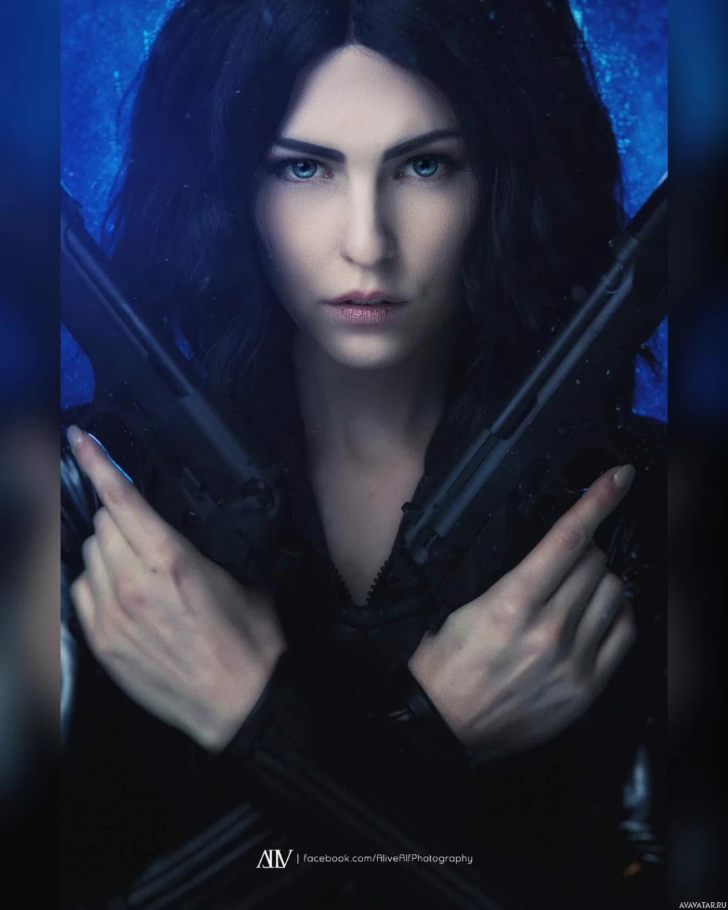 На снимке изображена женщина с чёрными волосами. Она носит черный наряд и держит перед грудью два пистолета. Ее выражение серьезное, и она, кажется, смотрит прямо в камеру. На заднем плане есть синий оттенок, который предполагает подводную обстановку или среду на водную тематику.