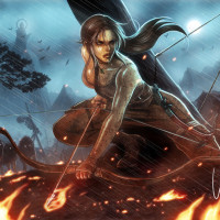 an action pose, holding a bow and arrow, and there's a stormy backdrop with fire and debris. There are also flames visible around her. The overall setting suggests adventure and survival themes that are common in the Tomb