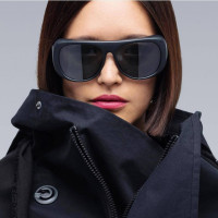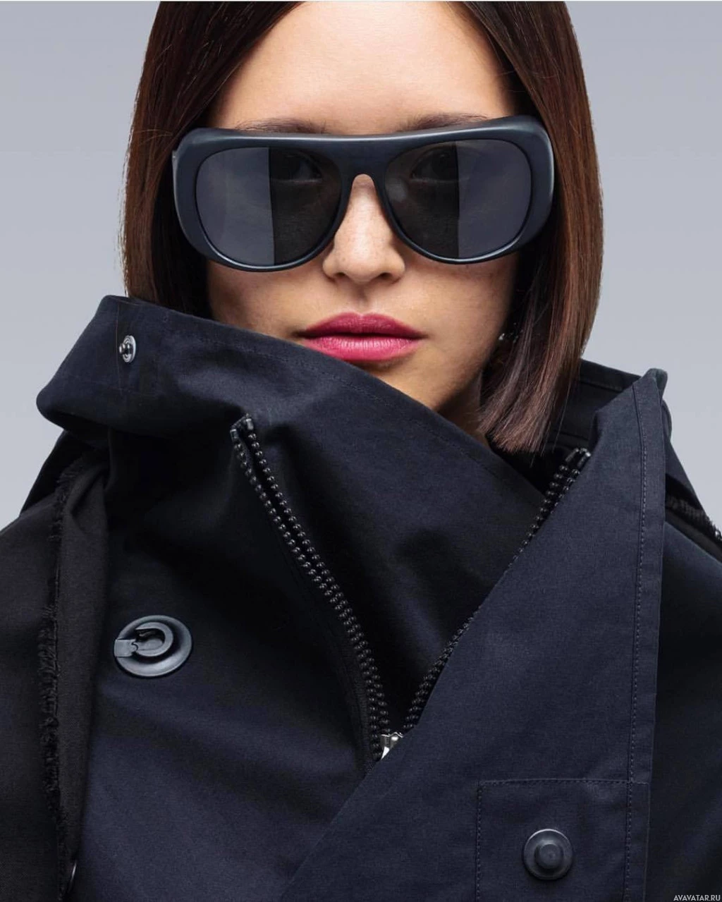 a dark jacket with the hood up. She is looking directly at the camera, and her expression is neutral. It appears to be a fashion or editorial photograph, designed to showcase the clothing and accessories featured.
