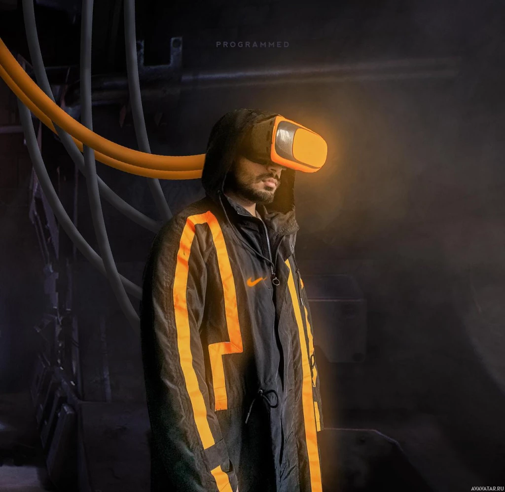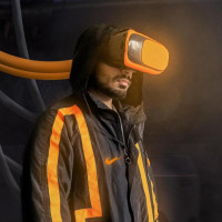 a virtual reality (VR) headset and what appears to be an orange safety vest. They are standing in a dimly lit,