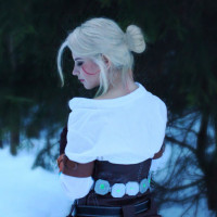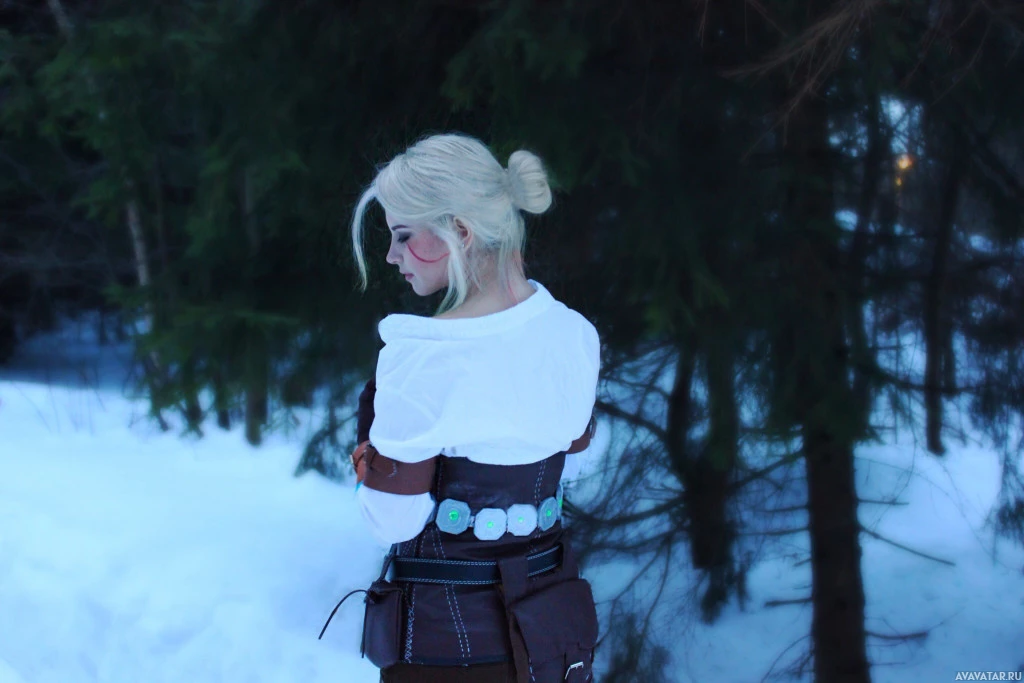 the video game "The Witcher 3: Wild Hunt." The individual is wearing costume elements that are characteristic of Ciri's appearance in the game, including a white blonde wig and a brown