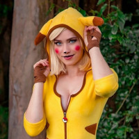 The image features a woman wearing a costume that resembles Pikachu, a character from the Pokémon series. She is blonde and posing in front of