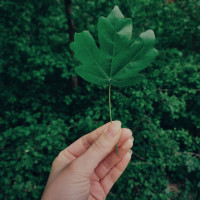 На картинке изображена рука, держащая один зеленый лист. Фон предполагает, что его можно взять в лесистой местности, причем лист удерживается на естественном фоне листвы и деревьев.