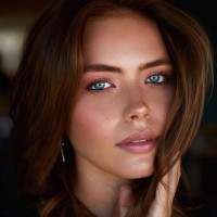 На снимке изображена женщина с легким макияжем на глазах и губах, немного отводя взгляд от камеры. Она имеет длинные волосы и носит то, что кажется черной одеждой. Ее выражение мягкое и созерцательное.