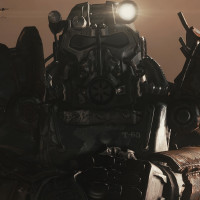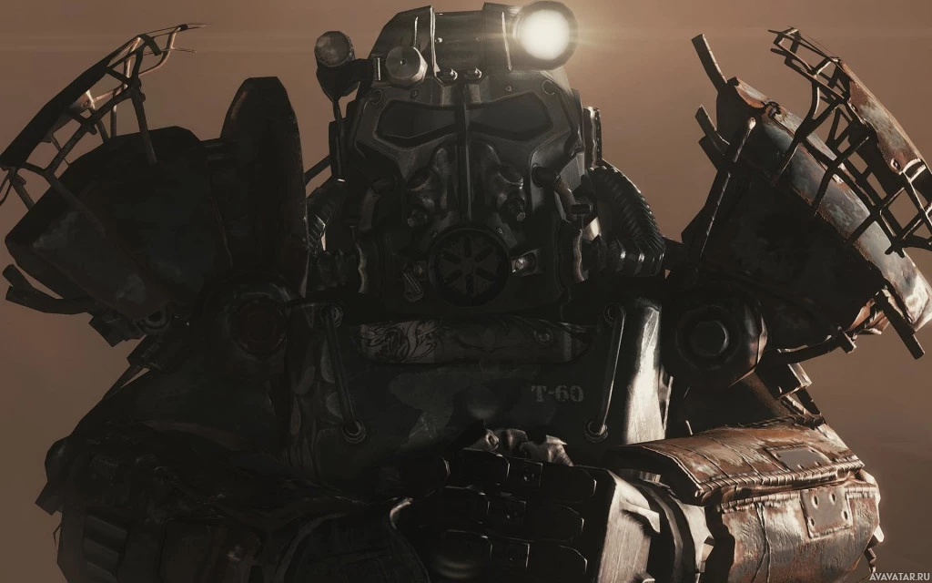 an iconic suit of power armor, which is a signature element of this character's design within the games. The armor is heavily detailed and gives the impression of being used and weathered by battle or time. The setting suggests