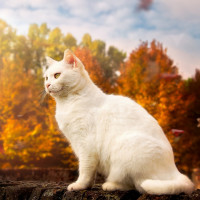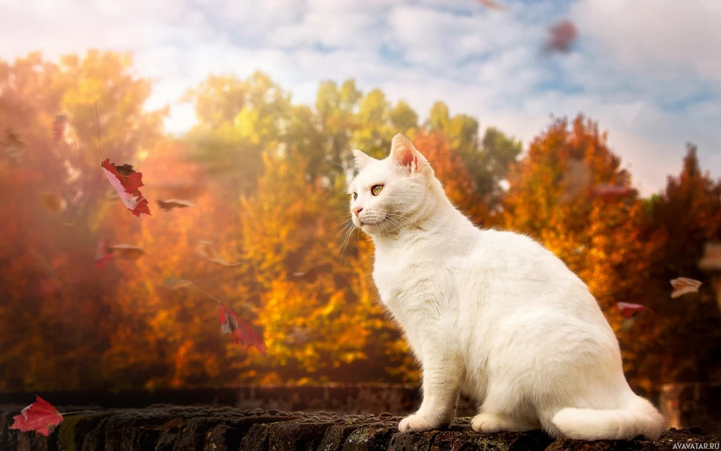 a white cat sitting on what appears to be a stone wall or surface in autumn. The background is filled with