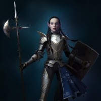 a shield with a crest on the other. This combination suggests that the character might be skilled in both combat and defense. The helmet has pointed ears, which is a common feature for fantasy elves, signifying their connection to nature and often associated with heightened senses or