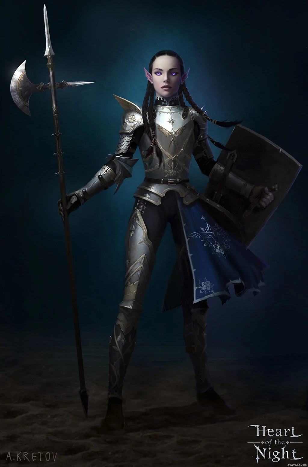an underground cavern or a dungeon setting. This further emphasizes the fantastical elements of the image. There's also a logo at the bottom that says "Heart of Darkness," which could be related to the name of the game, book series, or movie in which this character appears. The overall style is detailed and realistic with a touch of fantasy artistry. The lighting and shadows give depth to the image, making it visually striking.