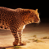 sandy terrain with sparse vegetation. The lighting in the photo suggests it may be either dawn or dusk, providing a soft and warm backlight that highlights the animal's silhouette against a darker background.