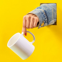 The image shows a hand holding a cup, seemingly pulling it out of the wall or from some unseen source. It's an unusual and creative way to display a cup, possibly for advertising or artistic purposes.