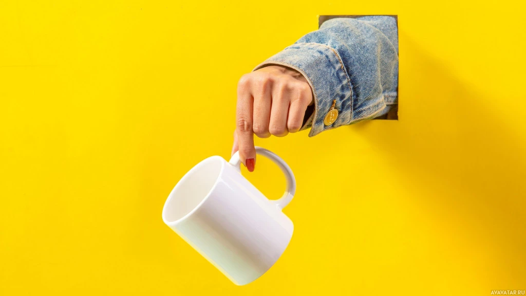 На картинке изображена рука, держащая чашку, вытаскивающая ее из стены или из какого-то невидимого источника. Это необычный и творческий способ отображения чашки, возможно, в рекламных или художественных целях.