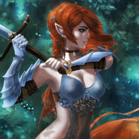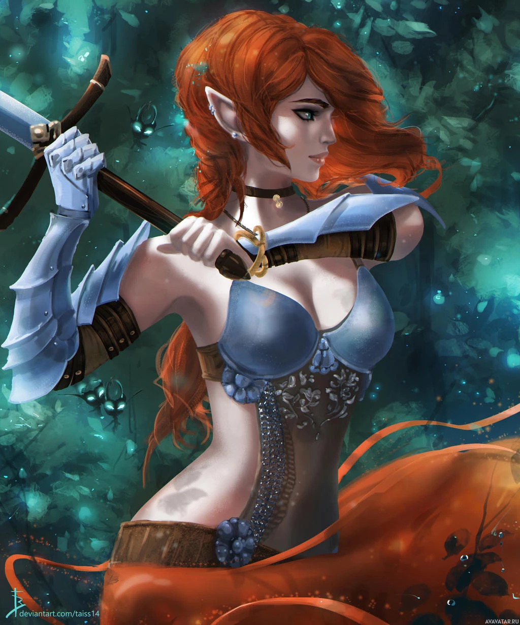 Картинка показывает женского персонажа в фантастической обстановке. Она держит то, что кажется эльфийским мечом, и одета в доспехи с элементами, которые предполагают, что она может быть эльфом или частью эльфийской культуры, такими как остроконечные уши и стили одежды, обычно связанные с эльфами в фэнтезийной литературе и средствах массовой информации. Фон имеет мистическое и магическое ощущение, возможно, изображая зачарованный лес или мистическое царство.