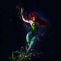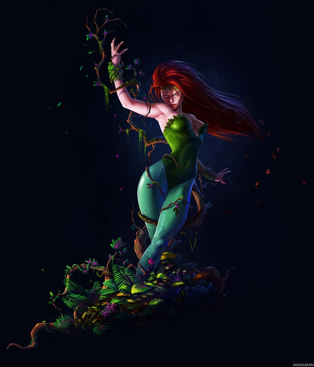 Poison Ivy, known from the Batman comics and media. She is depicted in an artistic style with