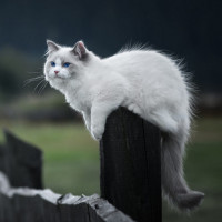 an alert expression, and its fur is white with some grey patches. The background suggests it might be either dawn or dusk due to