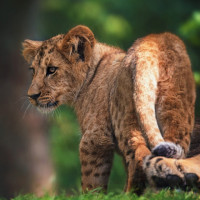 potential threats or prey. There are trees and bushes in the background, indicating a lush