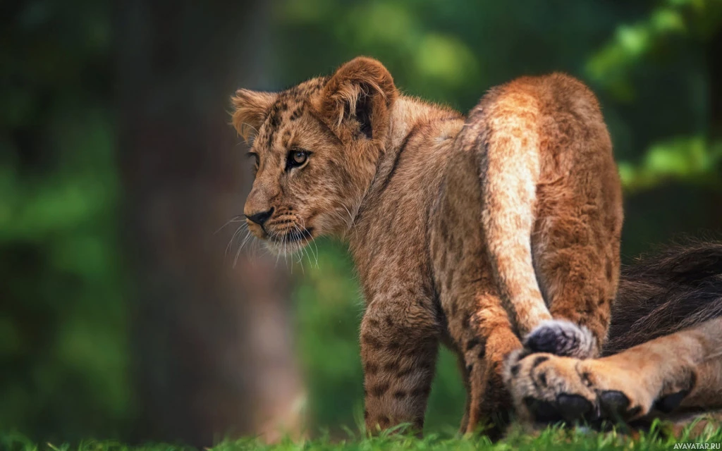 natural habitat, possibly on the savannah or grassland. The cub is standing and looking forward with an alert posture, which suggests it might be observing its surroundings or watching for