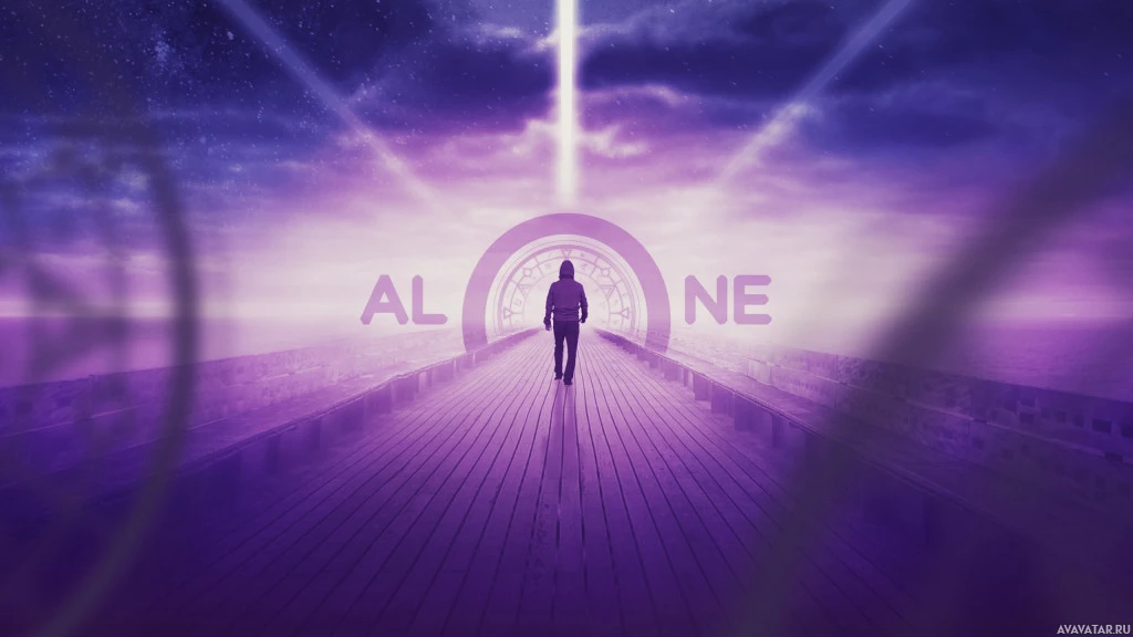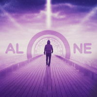 The image depicts a person standing in front of a large, illuminated gateway. The individual appears to be looking out towards the gate or entrance. There is text at the top that reads "ALONE" in