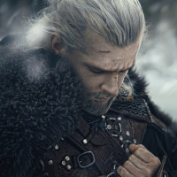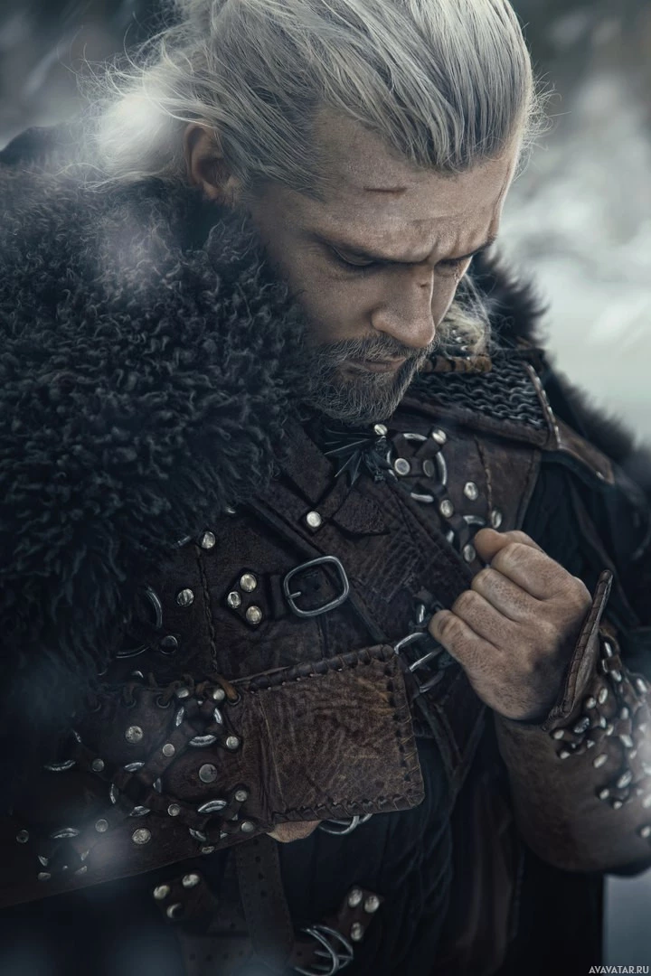 The image depicts a character who is portraying Geralt of Rivia, a central figure from