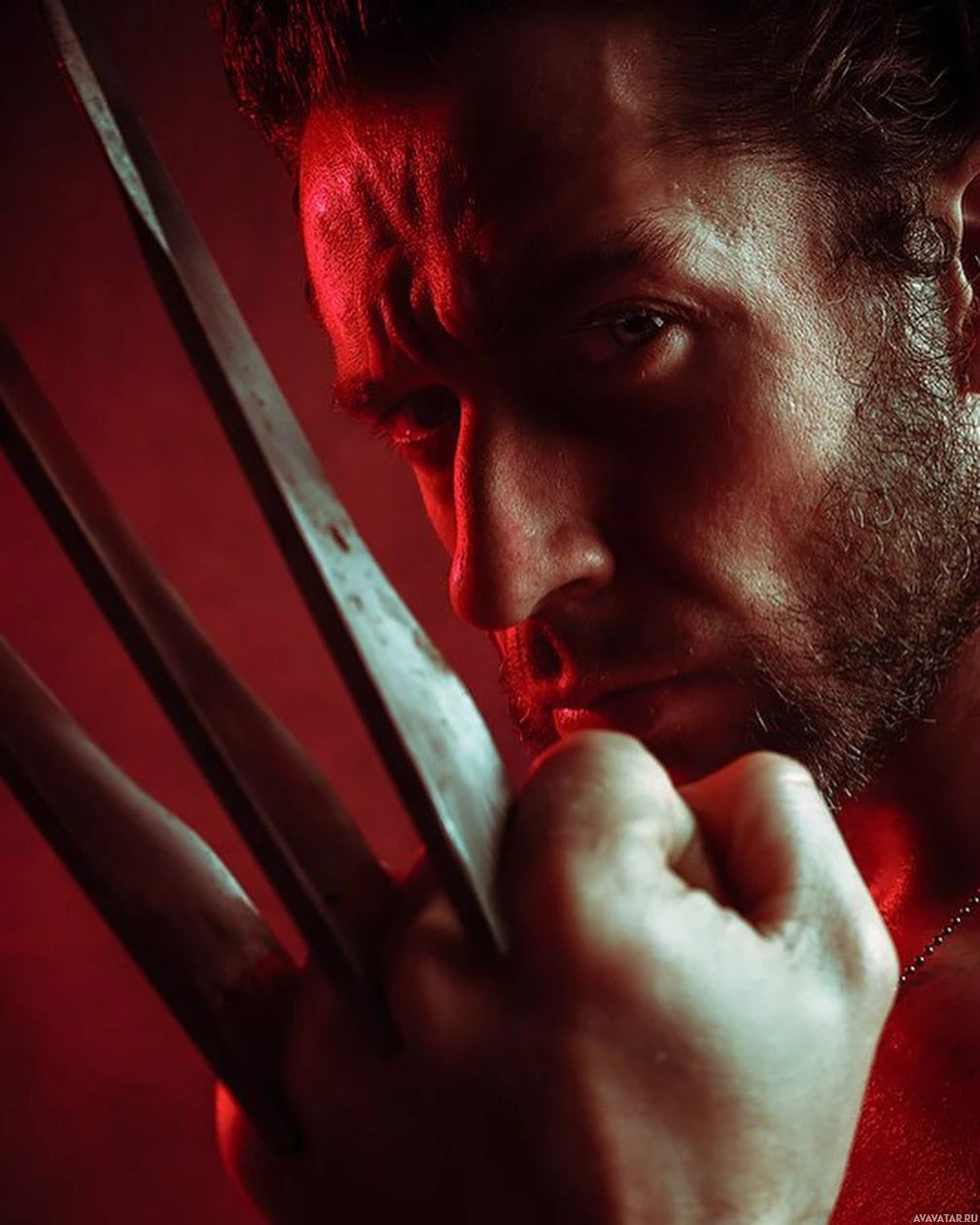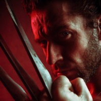 an intense expression, with his arms outstretched and holding claw-like objects that are characteristic of the character Wolverine from the X-Men comic book series. The background is red and gives off