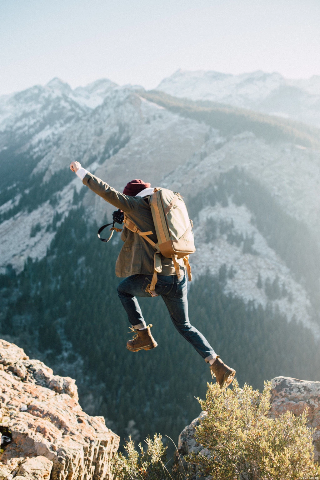 The image shows a person in the foreground, appearing to be jumping or leaping off a cliff into an expansive