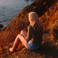 coastal areas. The person's hair is blonde, and they are dressed casually. The angle of the photo suggests it was taken from a distance or at some elevation, providing