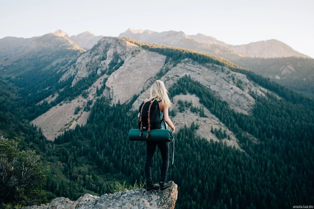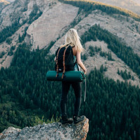a rocky outcrop with their back turned to the camera. The individual is wearing a backpack and appears to be hiking, given the context provided in your description. They are looking towards a scenic landscape that includes mountains and forested areas, suggesting they might be at