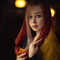 blue eyes, and her expression is soft and contemplative as she gazes at the camera. The background is blurred, but it gives off an ambiance of