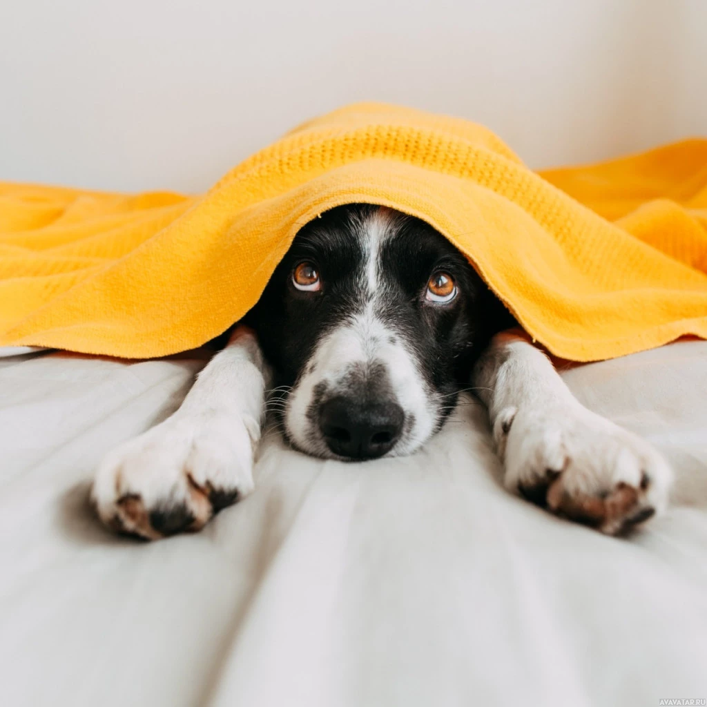 a yellow blanket or towel, which is draped over part of its body. The expression on the dog's face suggests it might be in a relaxed or playful state.