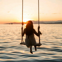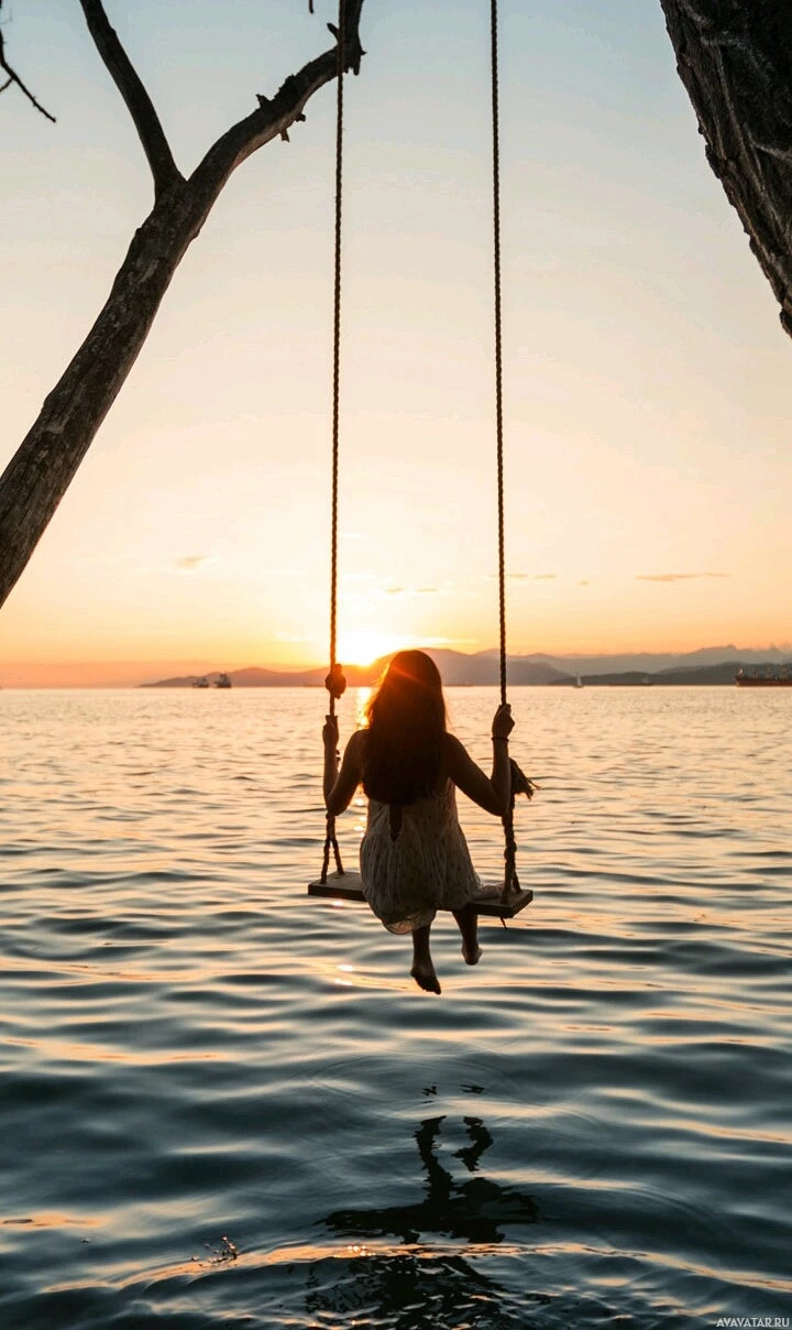 a young girl sitting on a swing. She is wearing a dress and appears to be hanging from the chains of the swing. Behind her, there's