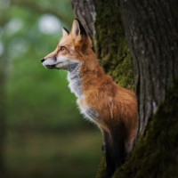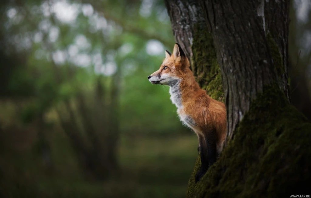Картинка показывает лису, выглядывающую из-за ствола дерева. Лиса наблюдает за своим окружением, возможно, в естественном лесу или лесистой местности. Освещение предполагает, что это может быть либо рассвет, либо сумерки из-за мягкого освещения.