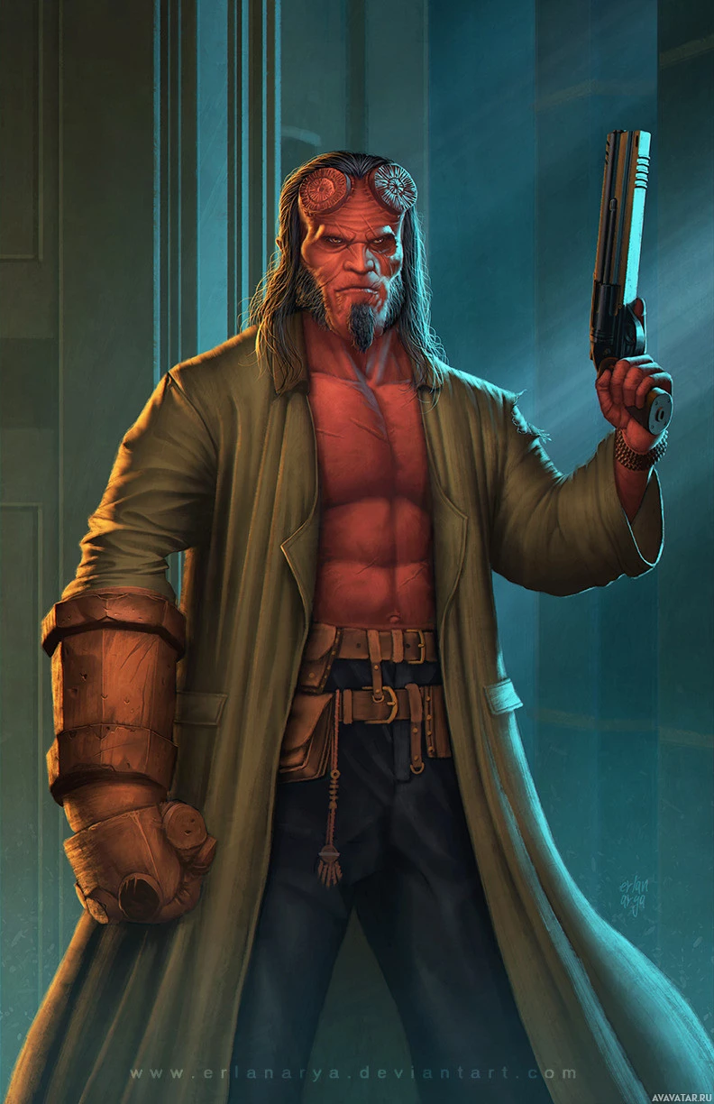 The image shows a character that resembles Hellboy, a fictional comic