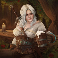 a wooden bench with a forest setting around her. Ciri is wearing armor and holding a cup, possibly containing a beverage like tea or ale. The overall style of the artwork is detailed and evokes a fantasy aesthetic consistent with the game's universe.